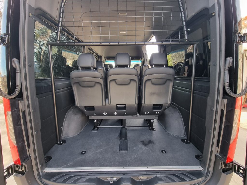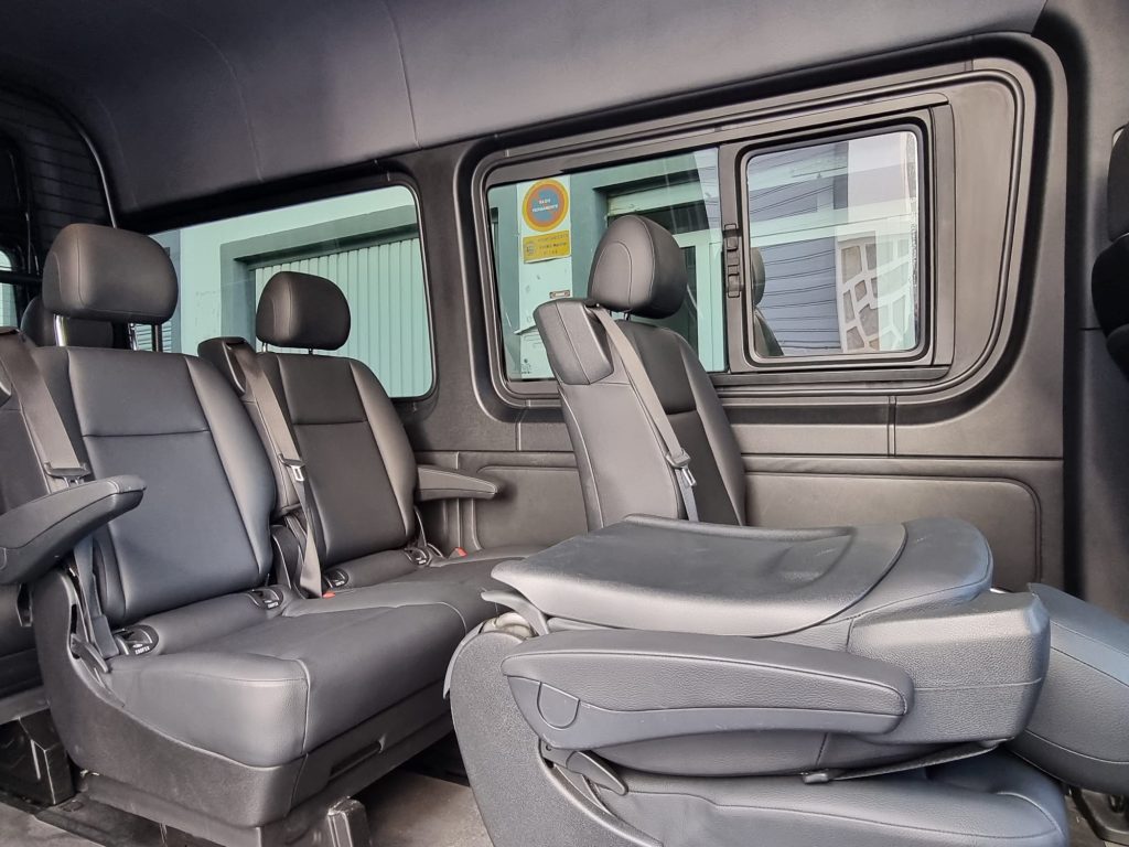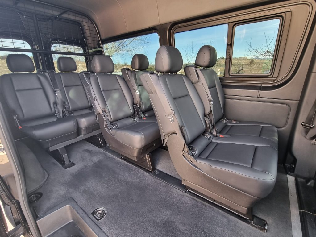 Furgoneta de pasajeros Mercedes Sprinter del año 2021. Motor diésel 2.2. Dispone de 9 plazas y un pequeño volumen de carga. Tiene pantalla táctil con Android Auto y Apple Car Play, radio CD, MP3, varias entradas USB, teléfono, bluetooth, climatizador, control por voz, control de velocidad, mandos en volante, etc.